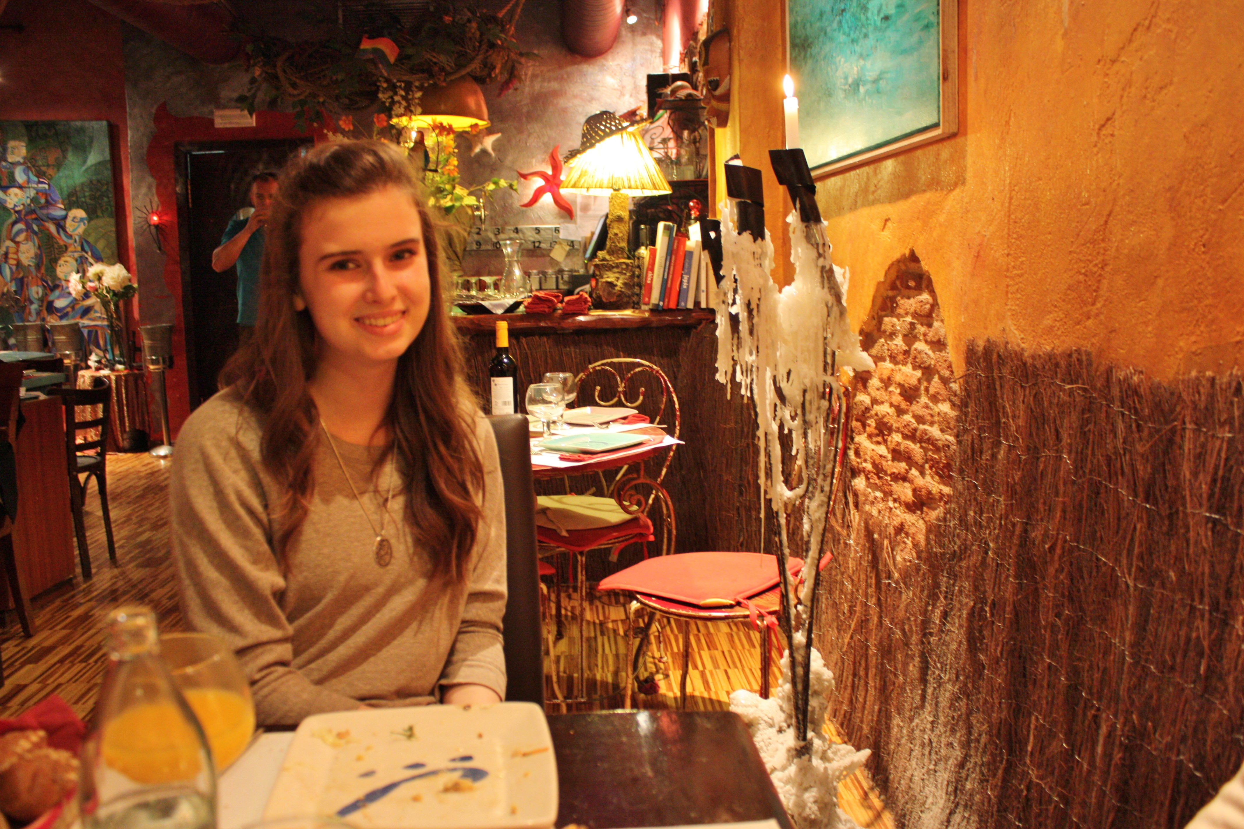 Logan at Isla del Tesoro. Interesting decor and a huge burning candle with years worth of wax