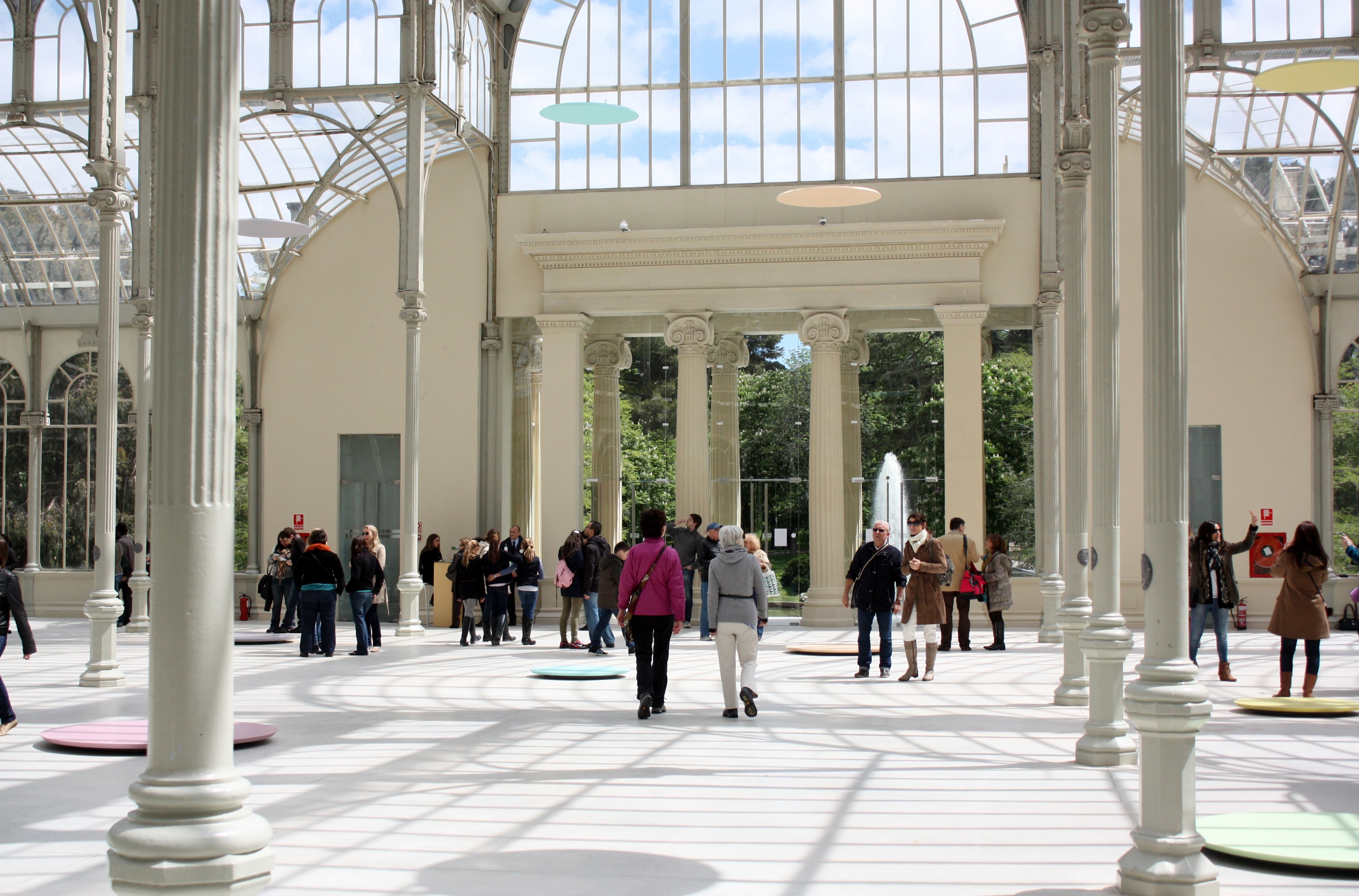 Inside the Palacio de Cristal ~ dics on the floor are part of the modern art exhibition