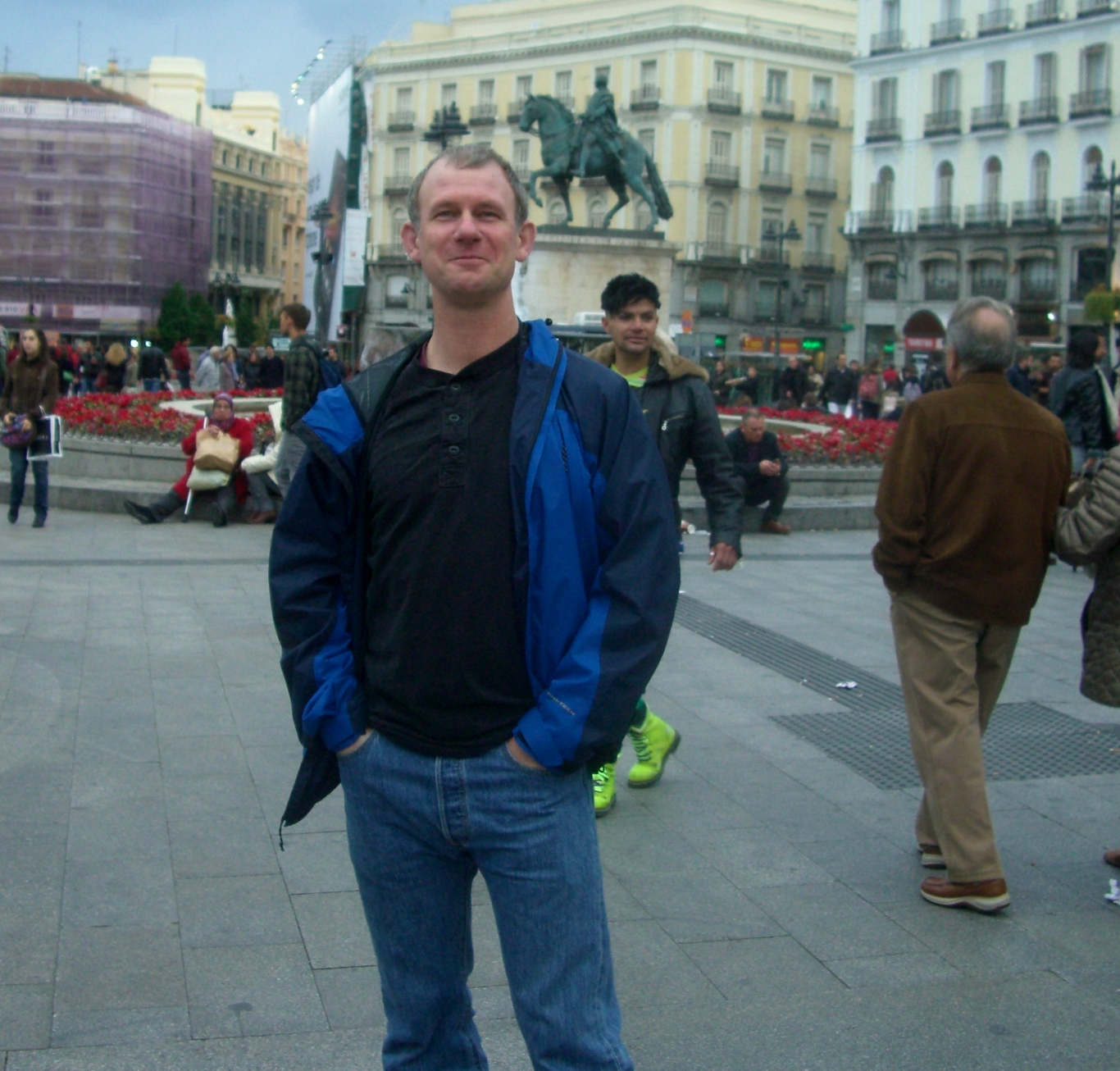 During our short weekend trip to Spain, my daughter Logan was taking photos at Plaza de Puerta del Sol when a very colorfully dressed man did his best pose. First he sees his chance: